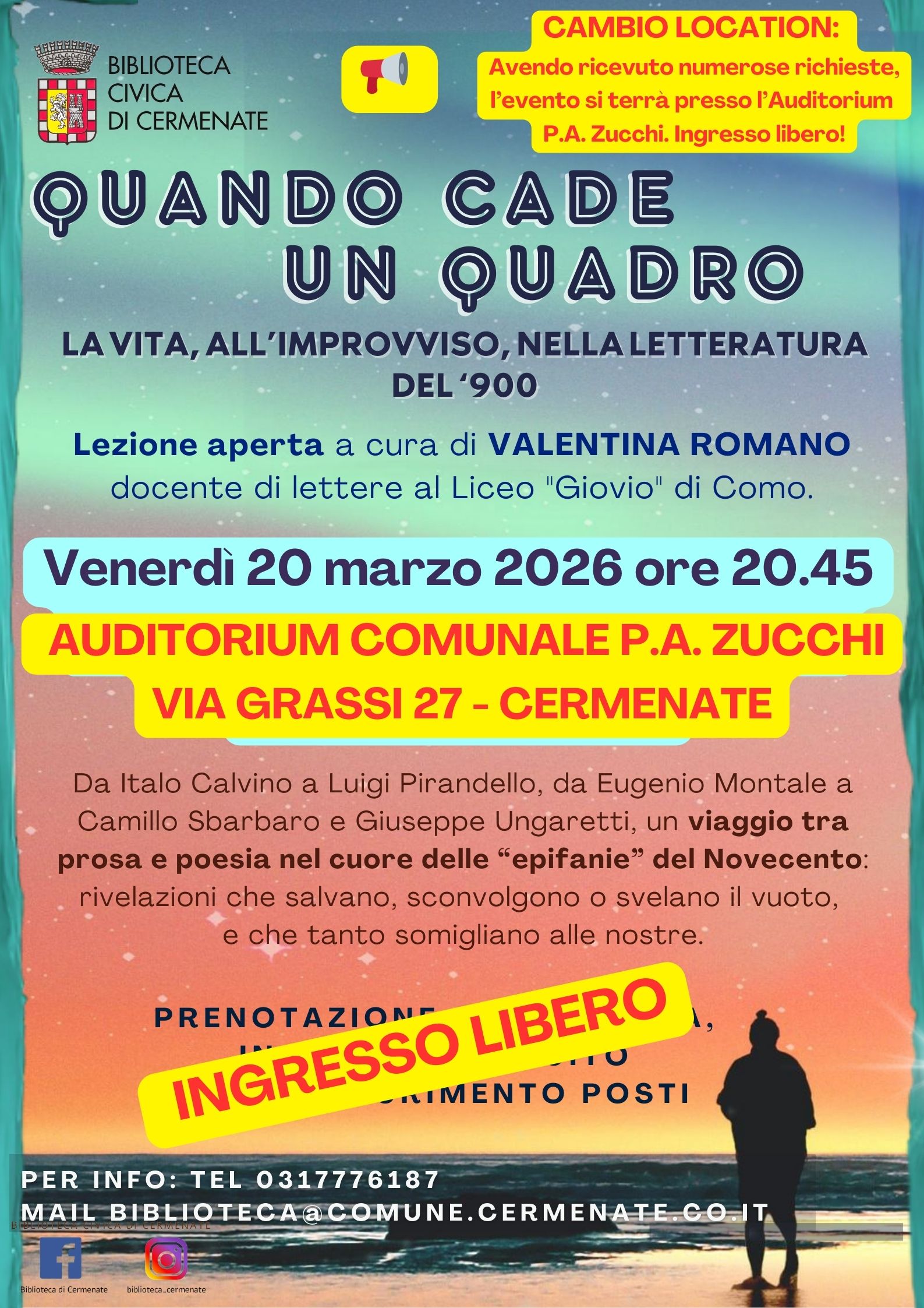 Per le numerose richieste ricevute, la lezione aperta “Quando cade un quadro. La vita, all’improvviso, nella letteratura del ’900” si terrà presso l’Auditorium comunale P. A. Zucchi di via Grassi 27 - Cermenate.