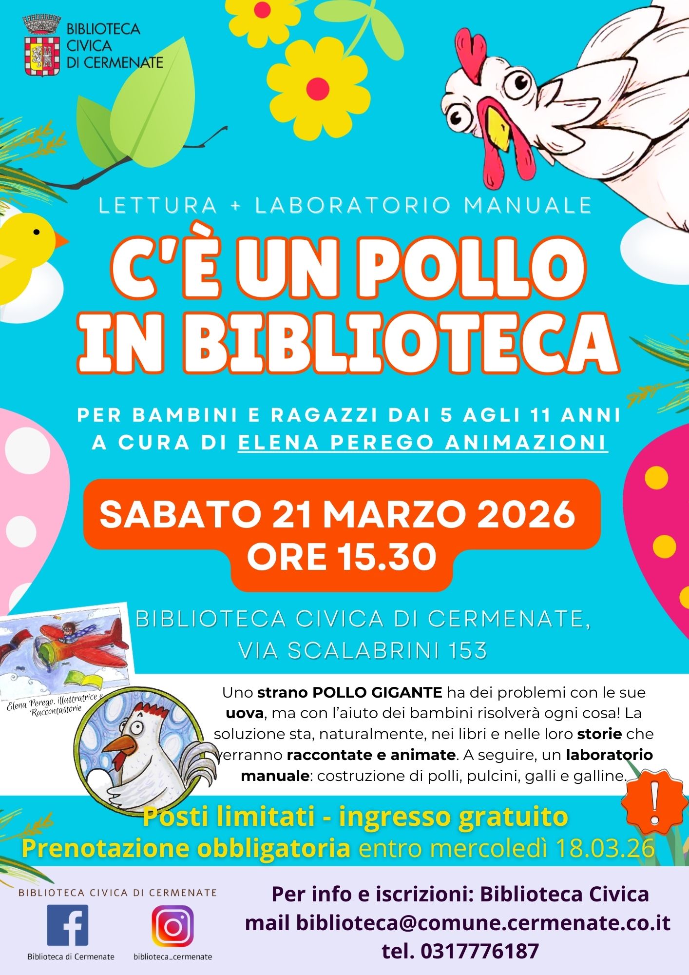 Vi aspettiamo sabato 21 marzo 2026 alle ore 15.30 presso la Biblioteca Civica (via Scalabrini 153) per un pomeriggio speciale fatto di tante bellissime storie animate e un laboratorio manuale: costruzione di polli, pulcini, galli, galline.