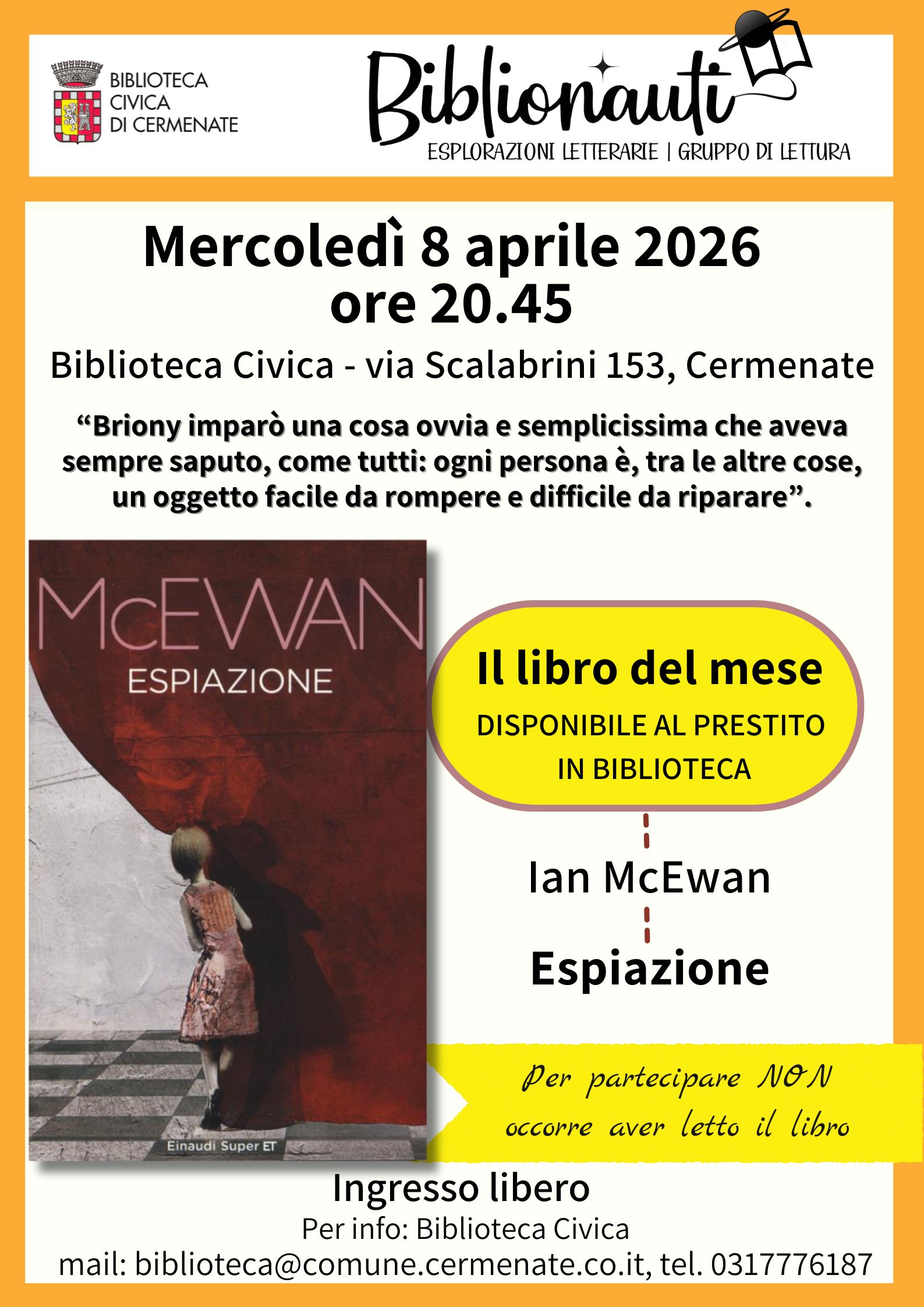 Vi invitiamo a partecipare al gruppo di lettura Biblionauti - esplorazioni letterarie: mercoledì 8 aprile 2026 alle ore 20.45 vi aspettiamo presso la Biblioteca Civica, via Scalabrini 153, per parlare del romanzo: Espiazione di Ian McEwan. L'ingresso è libero e gratuito.