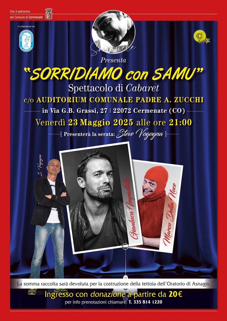 Venerdì 23 maggio 2025 a partire dalle ore 21.00 all'Auditorium comunale Padre Zucchi, in via Grassi 27 Cermenate (CO), nuovo appuntamento della rassgna Sorridiamo con Samu, iniziativa a scopo benefico proposta da ASD Adolfo Consolini, con il patrocinio del Comune di Cermenate.